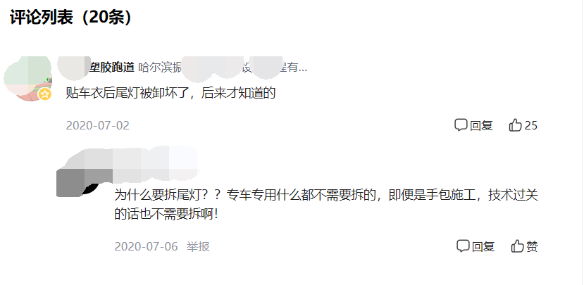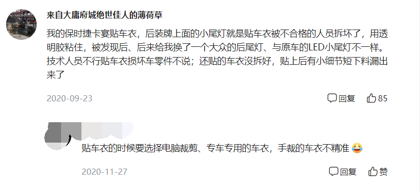 隱形車衣有專車專用和手工裁膜兩種,專車專用屬于電腦裁剪,不需要拆件,不需要動刀;而其中手裁(或說手包)是人工裁膜,需要動刀和拆件的,整車下來,大概需要動300刀左右,拆件部位包括門把手、LOGO、汽車尾標等。這些我是知道的,但是拆除尾燈?頭一回聽,按這個邏輯,我估計前面的大燈也是需要卸下來拆除再裝的。